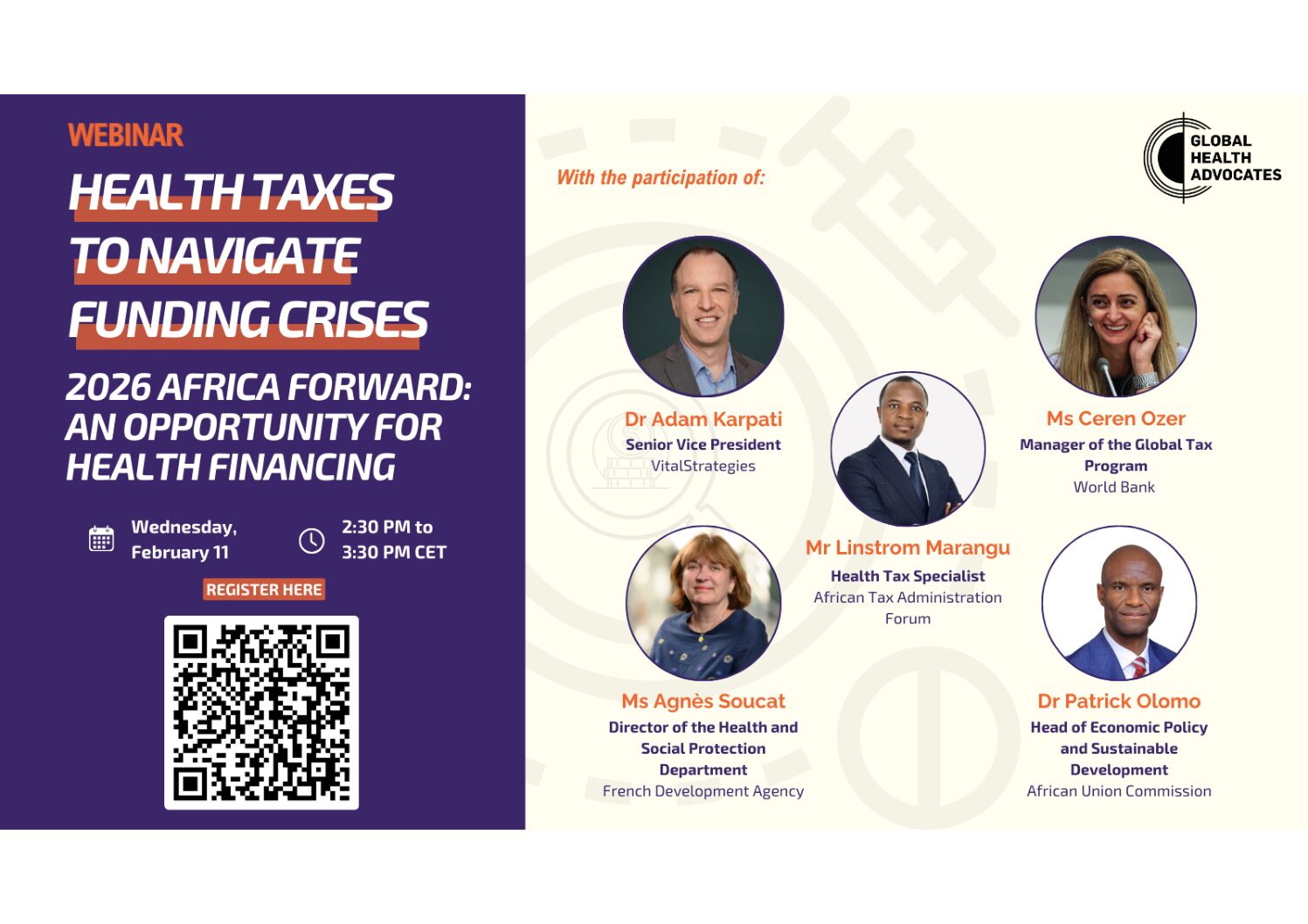 Rejoignez-nous pour notre webinaire « Health taxes to navigate funding crises », qui se tiendra le mercredi 11 février 2026, de 14h30 à 15h30 CET.